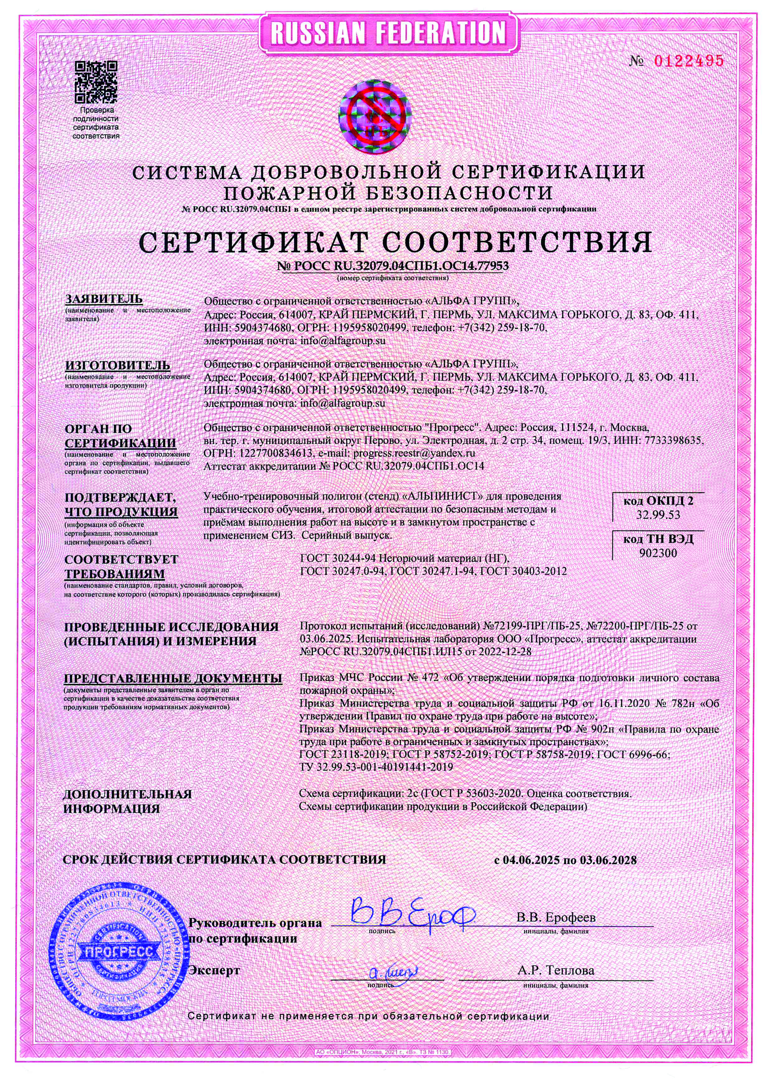 - Учебные комплексы «АЛЬПИНИСТ» сертифицированы и изготавливаются по Техническим условиям ООО «АЛЬФА ГРУПП» Полигон учебно-тренировочный ТУ 32.99.53-001-40191441-2019.